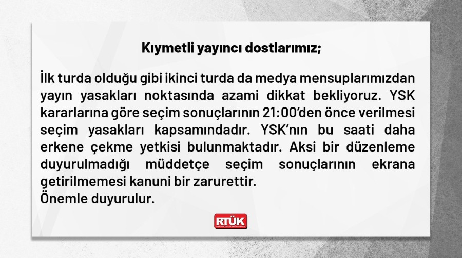 Şahin, Twitter üzerinden yaptığı paylaşımda medyadan azami dikkat beklediklerini ifade ederken, "Seçim sonuçlarının 21.00'den önce verilmesi yasak kapsamındadır" denildi.