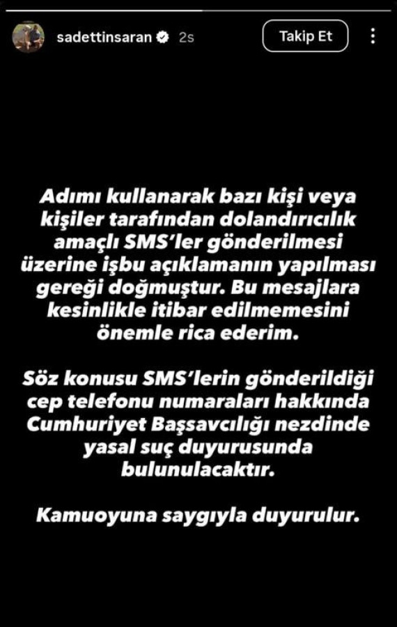 "Adımı kullanarak bazı kişi veya kişiler tarafından dolandırıcılık amaçlı SMS'ler gönderilmesi üzerine işbu açıklamanın yapılması gereği doğmuştur. Bu mesajlara kesinklikle itibar edilmemesini önemle rica ederim.