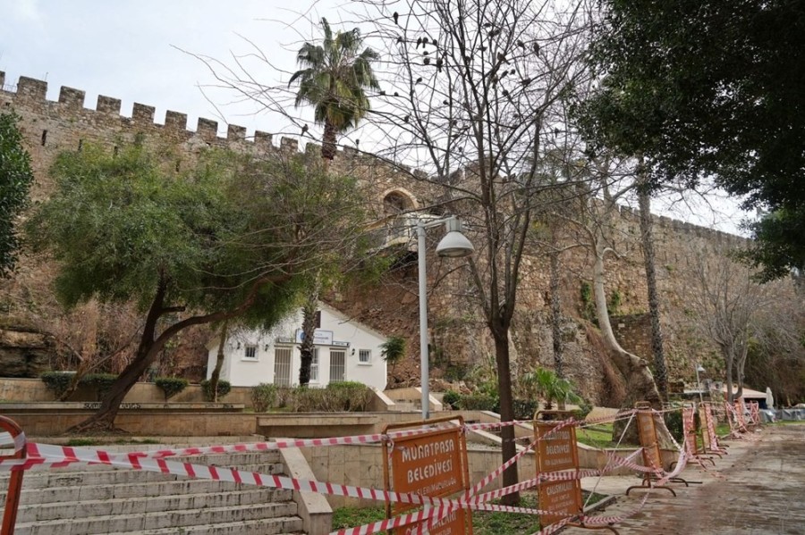 Antalya'nın tarihi Kaleiçi surlarında, iki gün süren sağanak yağışın ardından yıkıntılar meydana geldi. Toprağın kayıp surların çökmesiyle birlikte olayın yaşandığı yerdeki bir işletme havada asılı kaldı.