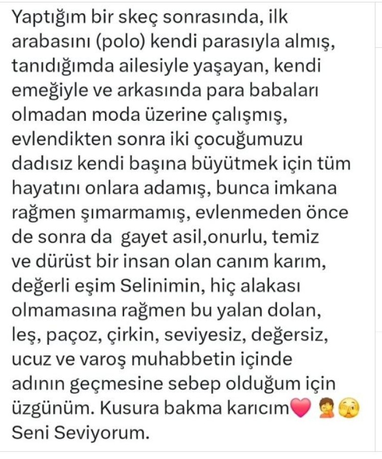 "Yaptığım bir skeç sonrasında, ilk arabasını (polo) kendi parasıyla almış, tanıdığımda ailesiyle yaşayan, kendi emeğiyle ve arkasında para babaları olmadan moda üzerine çalışmış, evlendikten sonra iki çocuğumuzu dadısız kendi başına büyütmek için tüm hayatını onlara adamış, bunca imkana rağmen şımarmamış, evlenmeden önce de sonra da gayet asil,onurlu, temiz ve dürüst bir insan olan canım karım, değerli eşim Selinimin, hiç alakası olmamasına rağmen bu yalan dolan, leş, paçoz, çirkin, seviyesiz, değersiz, ucuz ve varoş muhabbetin içinde adının geçmesine sebep olduğum için üzgünüm. Kusura bakma karıcım. Seni seviyorum."