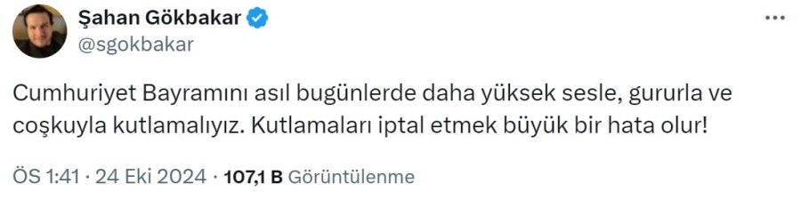 Bu karara komedyen Şahan Gökbakar tepki gösterdi. Gökbakar X hesabından yaptığı açıklamada "Cumhuriyet Bayramı'nı asıl bugünlerde daha yüksek sesle, gururla ve coşkuyla kutlamalıyız. Kutlamaları iptal etmek büyük bir hata olur!" ifadelerini kullandı.