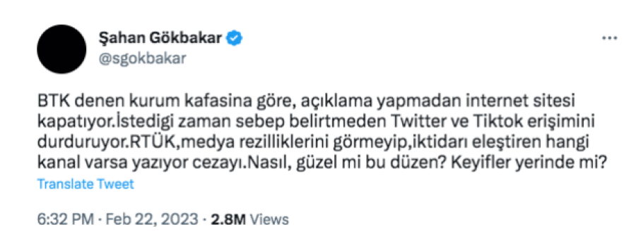 "BTK denen kurum kafasına göre, açıklama yapmadan internet sitesi kapatıyor. İstediği zaman sebep belirtmeden Twitter ve TikTok erişimini durduruyor. RTÜK, medya rezilliklerini görmeyip, iktidarı eleştiren hangi kanal varsa yazıyor cezayı.