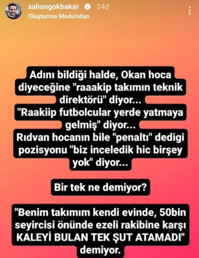 İsmail Kartal'ın Okan Buruk hakkında ''rakip takım teknik direktörü'' ifadesini kullanmasına itiraz eden Şahan Gökbakar, sosyal medya hesabından paylaşım yaparak İsmail Kartal'ı eleştirdi.