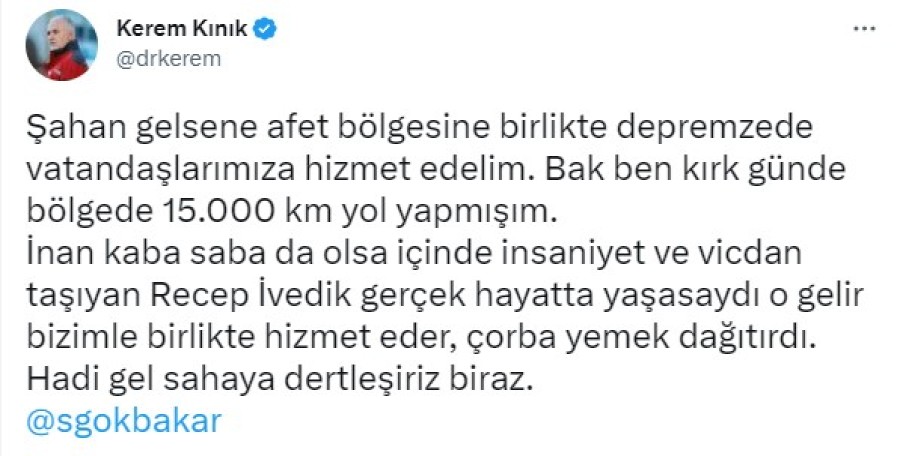 "Şahan gelsene afet bölgesine birlikte depremzede vatandaşlarımıza hizmet edelim. Bak ben kırk günde bölgede 15.000 km yol yapmışım. İnan kaba saba da olsa içinde insaniyet ve vicdan taşıyan Recep İvedik gerçek hayatta yaşasaydı o gelir bizimle birlikte hizmet eder, çorba yemek dağıtırdı. Hadi gel sahaya dertleşiriz biraz"