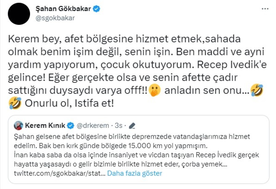 "Kerem bey, afet bölgesine hizmet etmek, sahada olmak benim işim değil, senin işin. Ben maddi ve ayni yardım yapıyorum, çocuk okutuyorum. Recep İvedik'e gelince! Eğer gerçekte olsa ve senin afette çadır sattığını duysaydı varya offf!! anladın sen onu... Onurlu ol, İstifa et!"
