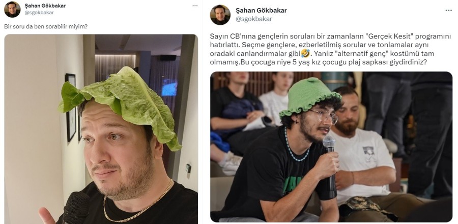 Oyuncu ve komedyen Şahan Gökbakar da yayını tiye alan bir paylaşım yaptı. Gökbakar, "Sayın Cumhurbaşkanına gençlerin soruları bir zamanların 'Gerçek Kesit' programını hatırlattı. Seçme gençlere, ezberletilmiş sorular ve tonlamalar aynı oradaki canlandırmalar gibi. Yalnız 'alternatif genç' kostümü tam olmamış. Bu çocuğa niye 5 yaş kız çocuğu plaj şapkası giydirdiniz?" yorumunda bulundu.