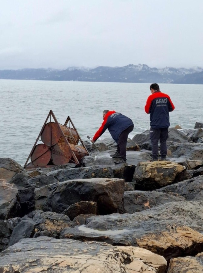 Ünye ilçesinin Gölevi Mahallesi'nde bulunan Ünye Belediyesi'ne ait Batıpark Plajı'nda dün akşam saatlerinde birbirine bağlı 3 adet boş varil sahile vurdu.