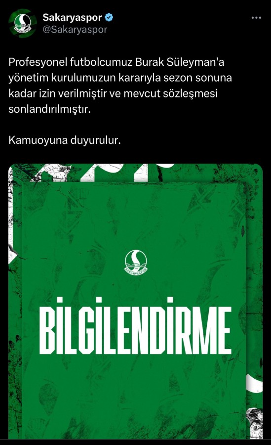 Kulübün sosyal medya hesabından yapılan açıklamada, "Profesyonel futbolcumuz Burak Süleyman'a yönetim kurulumuzun kararıyla sezon sonuna kadar izin verilmiştir ve mevcut sözleşmesi sonlandırılmıştır" denildi.
