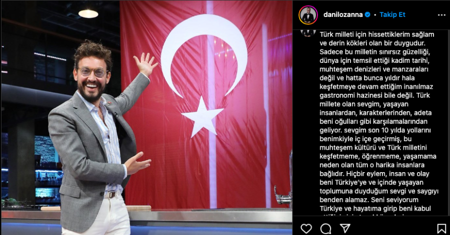"Türk milleti için hissettiklerim sağlam ve derin kökleri olan bir duygudur. Sadece bu milletin sınırsız güzelliği, dünya için temsil ettiği kadim tarihi, muhteşem denizleri ve manzaraları değil ve hatta bunca yıldır hâlâ keşfetmeye devam ettiğim inanılmaz gastronomi hazinesi bile değil. Türk millete olan sevgim, yaşayan insanlardan, karakterlerinden, adeta beni oğulları gibi karşılamalarından geliyor. Sevgim son 10 yılda yollarını benimkiyle iç içe geçirmiş, bu muhteşem kültürü ve Türk milletini keşfetmeme, öğrenmeme, yaşamama neden olan tüm o harika insanlara bağlıdır. Hiçbir eylem, insan ve olay beni Türkiye'ye ve içinde yaşayan toplumuna duyduğum sevgi ve saygıyı benden alamaz. Seni seviyorum Türkiye ve hayatıma girip beni kabul ettiğiniz için teşekkür ederim ve en çok da destek mesajlarınız, yanımda olduğunuz için sizlere teşekkür ediyorum. İyi ki varsınız."