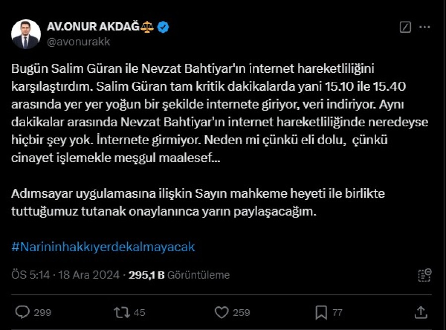 Narin Güran'ın cinayete kurban gitmesi kesinleşirken, cinayeti kimin işlediği henüz netleşmedi. Olayın en önemli sanıklarından olan Salim Güran'ın avukatı Onur Akdağ ise, dikkat çeken bir açıklama yaptı. Akdağ, sosyal medya hesabı üzerinden yaptığı paylaşımda, Narin'in kaybolduğu gün, Salim Güran ile Nevzat Bahtiyar'ın internet hareketliliğini karşılaştırdığını belirtti.