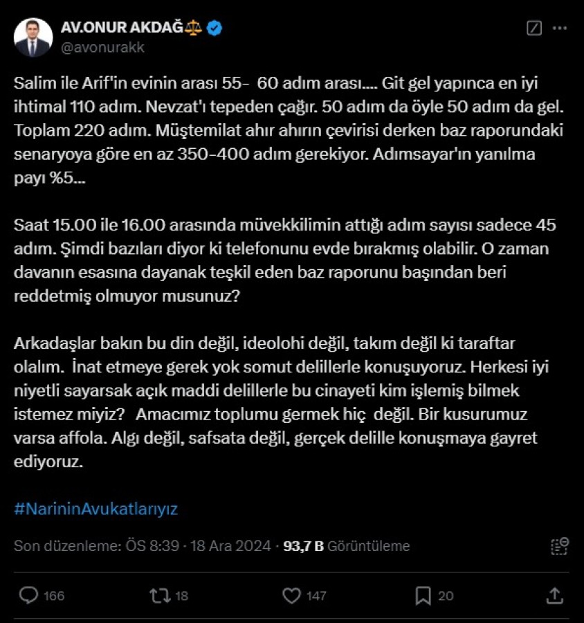 Narin cinayetinde amca Salim Güran'ın avukatı Onur Akdağ, Salim'in telefonunda olan adımsayar uygulamasındaki hareket sayısını paylaştı. Müvekkilini savunan avukat "Artık bir itiraf beklemiyoruz. Nevzat Bahtiyar o sırada cinayet işlemekle meşguldü" şeklinde konuştu.