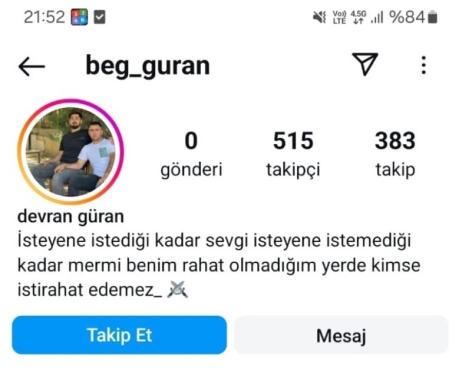 Devran Güran'ın Instagram hesabının biyografi kısmına "İsteyene istediği kadar sevgi, isteyene istemediği kadar mermi. Benim rahat olmadığım yerde kimse istirahat edemez" yazdığı gördüldü.