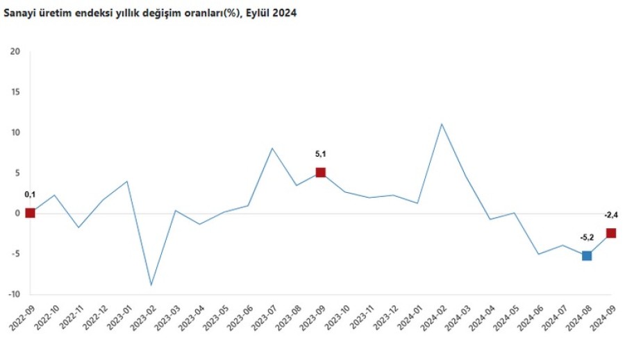 Sanayinin alt sektörleri (2021=100 referans yıllı) incelendiğinde, 2024 yılı Eylül ayında madencilik ve taş ocakçılığı sektörü endeksi bir önceki yılın aynı ayına göre yüzde 5,3 azaldı, imalat sanayi sektörü endeksi yüzde 2,5 azaldı ve elektrik, gaz, buhar ve iklimlendirme üretimi ve dağıtımı sektörü endeksi yüzde 1,1 arttı.