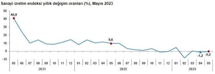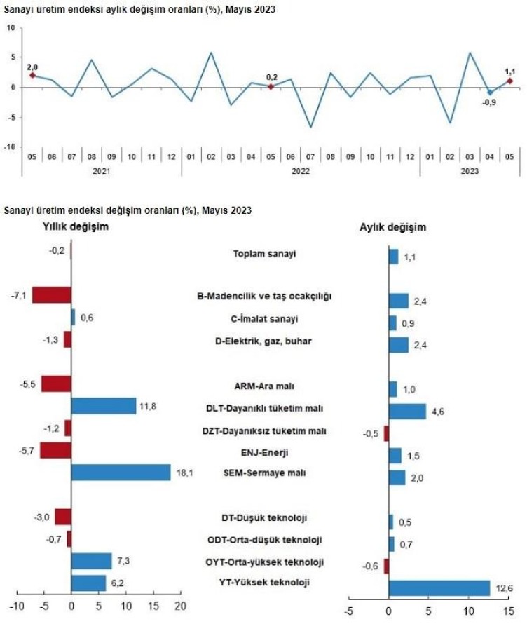 Sanayi üretimi mayıs ayında aylık yüzde 1,1 arttı. Beklentiler aylık yüzde 2,1 artacağı şeklindeydi. Yıllık bazda ise yüzde 0,2 düştü.