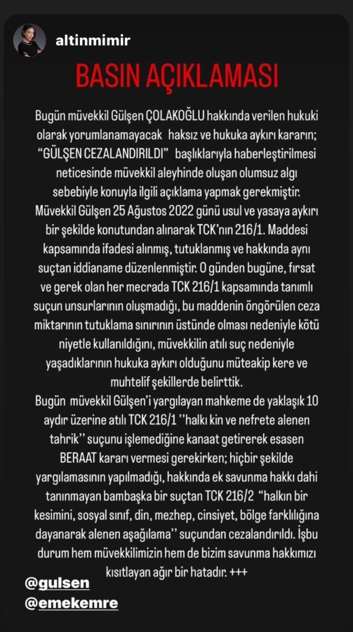 "Bugün müvekkil Gülşen ÇOLAKOĞLU hakkında verilen hukuki olarak yorumlanamayacak haksız ve hukuka aykırı kararın 'GÜLŞEN CEZALANDIRILDI' başlıklarıyla haberleştirilmesi neticesinde müvekkil aleyhinde oluşan olumsuz algı sebebiyle konuyla ilgili açıklama yapmak gerekmiştir. Müvekkil Gülşen 25 Ağustos 2022 günü usul ve yasaya aykırı bir şekilde konutundan alınarak TCK'nın 216/1. Maddesi kapsamında ifadesi alınmış, tutuklanmış ve hakkında aynı suçtan iddianame düzenlenmiştir. O günden bugüne, fırsat ve gerek olan her mecrada TCK 216/1 kapsamında tanımlı suçun unsurlarının oluşmadığı, bu maddenin öngörülen ceza miktarının tutuklama sınırının üstünde olması nedeniyle kötü niyetle kullanıldığını, müvekkilin atılı suç nedeniyle yaşadıklarının hukuka aykırı olduğunu müteakip kere ve muhtelif şekillerde belirttik. Bugün müvekkil Gülşen'i yargılayan mahkeme de 10 aydır üzerine atılı TCK 216/1 'halkı kin ve nefrete alenen tahrik' suçunu işlemediğine kanaat getirerek esasen BERAAT kararı vermesi gerekirken hiçbir şekilde yargılamasının yapılmadığı, hakkında ek savunma hakkı dahi tanınmayan bambaşka bir suçtan TCK 216/2 'halkın bir kesimini, sosyal sınıf, din, mezhep, cinsiyet, bölge farklılığına dayanarak alenen aşağılama' suçundan cezalandırıldı. İşbu durum hem müvekkilimizin hem de bizim savunma hakkınızı kısıtlayan ağır bir hatadır."