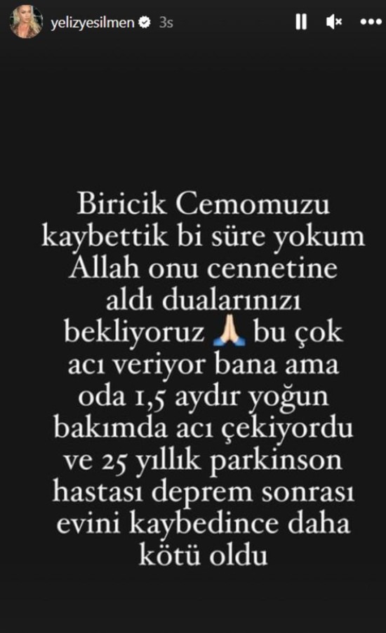 Yeşilmen "Biricik Cemomuzu kaybettik. Bir süre yokum. Allah onu cennetine aldı, dualarınızı bekliyoruz. Bu çok acı veriyor bana ama o da 1,5 aydır yoğun bakımda acı çekiyordu. 25 yıllık Parkinson hastası, deprem sonrası evini kaybedince daha kötü oldu." ifadeleri kullandı.