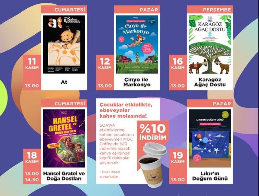 "Çinyo ile Markonyo"nun ebeveyn-çocuk tiyatrosu ile iplerinden kurtulmak isteyen bir kukla olan Çinyo ile onun için her şeyin iyi olmasını isteyen ustası Markonyo'nun hikayesine tanıklık edecekler. Çocuklar, "Hansel ve Gretel Doğa Dostları" masalını modern bir bakış açısıyla deneyimleyecek. "Lıkır'ın Doğum Günü", kelebek olmak istemeyen, küçük tırtıl Lıkır'ın hikayesini çocuklara unutamayacakları bir oyunla anlatıyor. "Sessiz Adam ve Sinek" oyunu ile Sessiz Adam'ın piknik yaparken onunla oynamak isteyen bir sinekle yaşadığı 'arkadaşlık' hikayesi, 7'den 77'ye herkes için eğlenceye dönüşecek.
