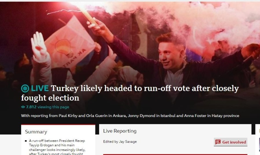 İngiltere basınından SkyNews, Anadolu Ajansı'nın verilerini paylaşarak "Sandıkların yaklaşık yüzde 97'si sayıldı, Recep Tayyip Erdoğan yüzde 49,39 oyla önde" ifadelerini kullandı.