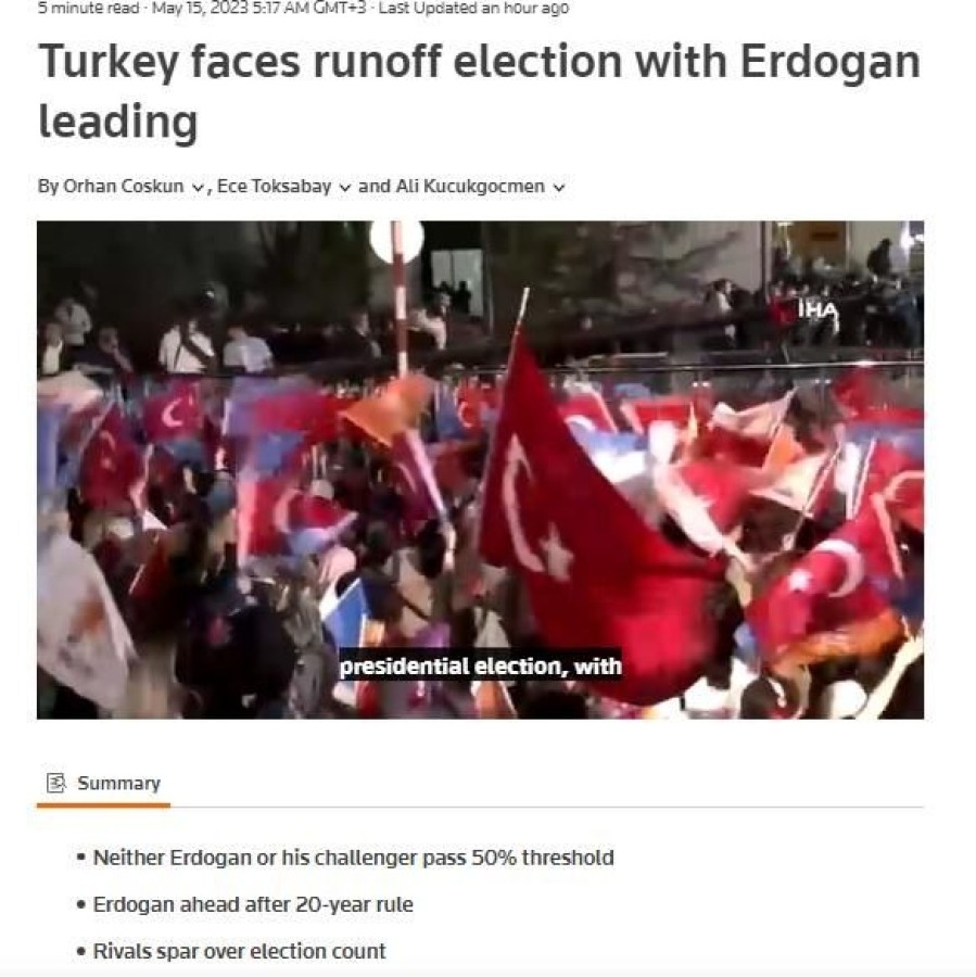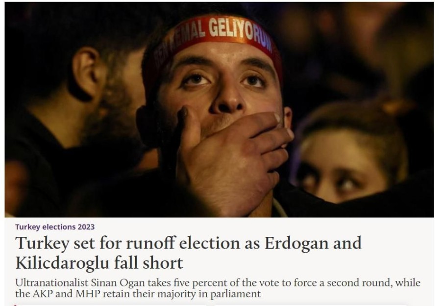 Middle East Eye tarafından yapılan haberde de seçimlere yoğun bir katılım olduğu vurgulandı. Sinan Oğan'ın oyların yaklaşık yüzde 5'ini aldığına dikkat çekildi, seçimlerin ikinci tura kalmasının beklendiğini yazdı.