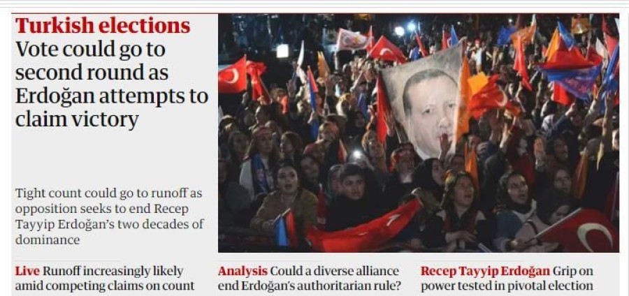 The Guardian, Erdoğan'ın "Seçim sonuçlarının henüz kesinleşmemiş olması, milletimizin tercihinin açıkça bizden yana olduğu gerçeğini değiştirmez" ifadelerini okuyucularıyla paylaştı.