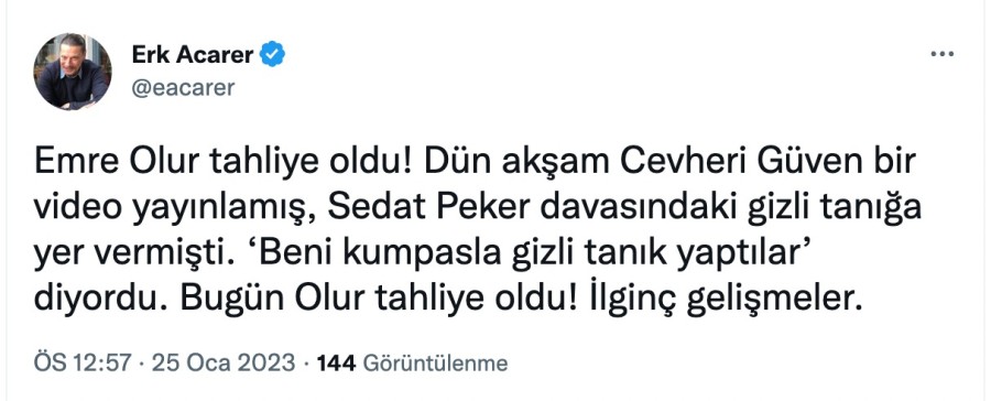 Gazeteci Erk Acarer de sosyal medya hesabından, "Emre Olur tahliye oldu! Dün akşam Cevheri Güven bir video yayınlamış, Sedat Peker davasındaki gizli tanığa yer vermişti. 'Beni kumpasla gizli tanık yaptılar' diyordu. Bugün Olur tahliye oldu! İlginç gelişmeler" ifadelerini kullandı.