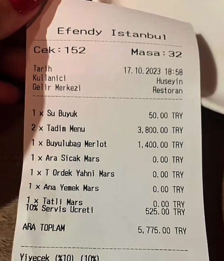Paylaşılan adisyona göre hesap 5 bin 775 TL tuttu. Öte yandan adisyonda servis ücretinin 525 TL yazıldığı da görüldü.