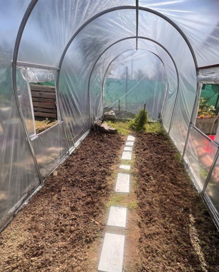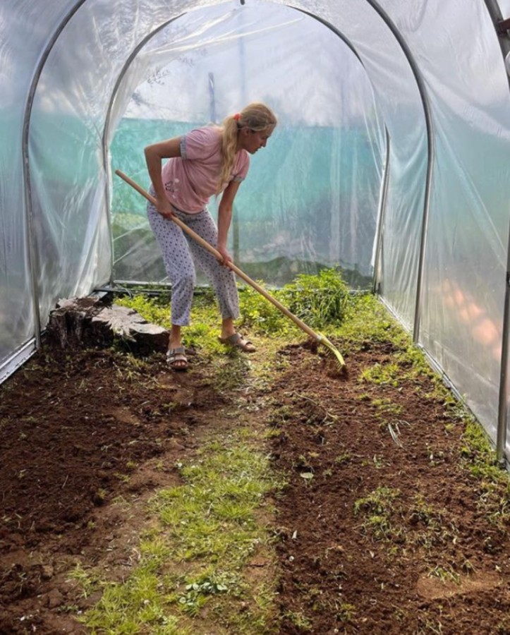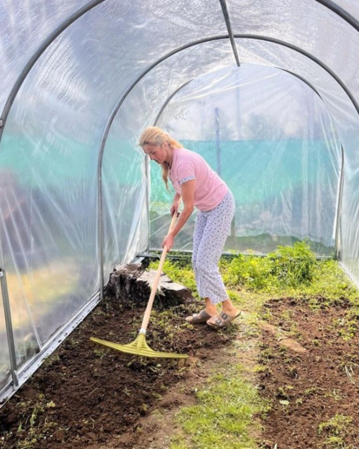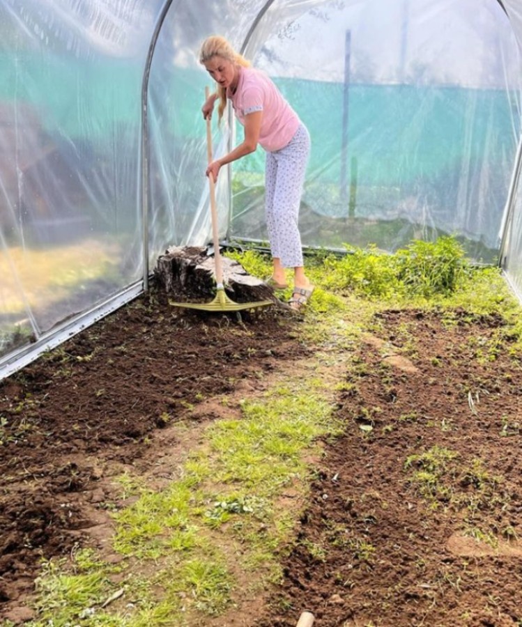 Özay, kendine küçük bir sera yaptırıp, önce tarım yapacağı alanı temizledi. Sonra da kazdı ve gübreledi. Ünlü manken eline tırmık alıp etrafı iyice topladı.