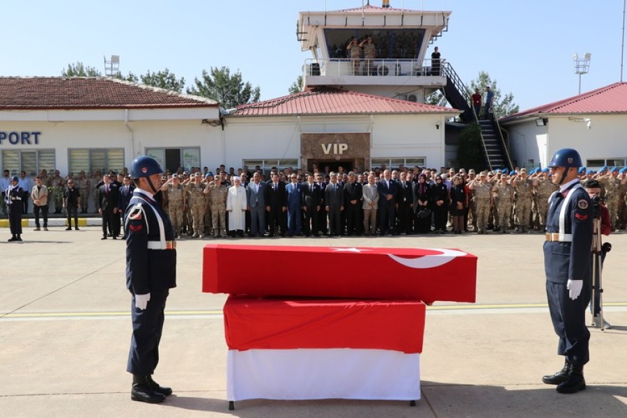 Siirt Havalimanı'nda düzenlenen törende, evli ve 1 çocuk babası olan şehit Ceylan'ın (33) Türk bayrağına sarılı naaşı katafalka konuldu, saygı duruşunda bulunulmasının ardından öz geçmişi okundu.