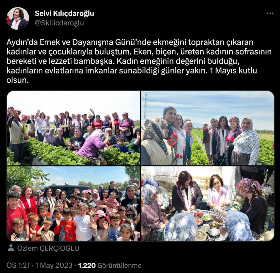 Selvi Kılıçdaroğlu, "Aydın'da Emek ve Dayanışma Günü'nde ekmeğini topraktan çıkaran kadınlar ve çocuklarıyla buluştum. Eken, biçen, üreten kadının sofrasının bereketi ve lezzeti bambaşka. Kadın emeğinin değerini bulduğu, kadınların evlatlarına imkanlar sunabildiği günler yakın. 1 Mayıs kutlu olsun" ifadelerine yer verdi.