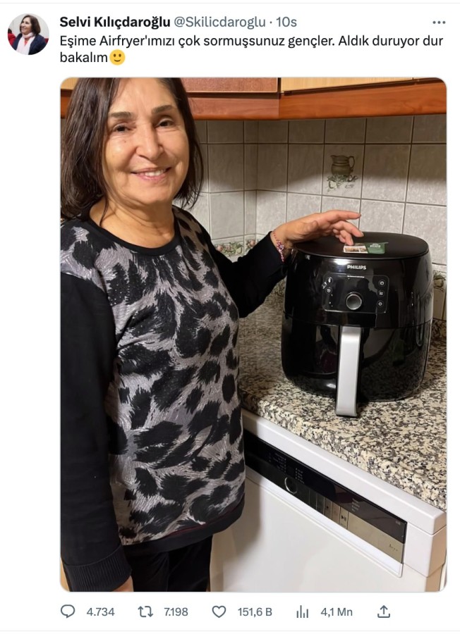 Millet İttifakı'nın Cumhurbaşkanı Adayı, CHP Genel Başkanı Kemal Kılıçdaroğlu'nun eşi Selvi Kılıçdaroğlu Twitter hesabından sosyal medyada gündem olan 'Airfryer' ile yaptığı paylaşımda,