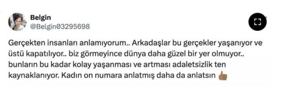 Yorumda "Biz görmeyince dünya daha güzel bir yer olmuyor. Bunların bu kadar kolay yaşanması ve artması adaletsizlikten kaynaklanıyor. Kadın on numara anlatmış daha da anlatsın" yazıyordu.