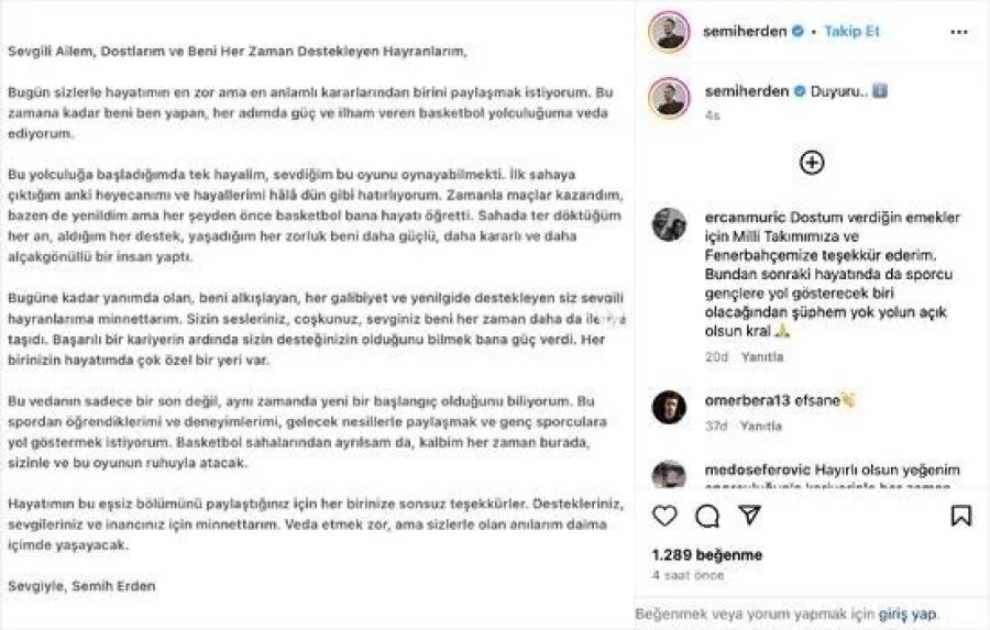 Bir dönem NBA'de de forma giyen milli basketbolcu Semih Erden kariyerine son verdiğini açıkladı.