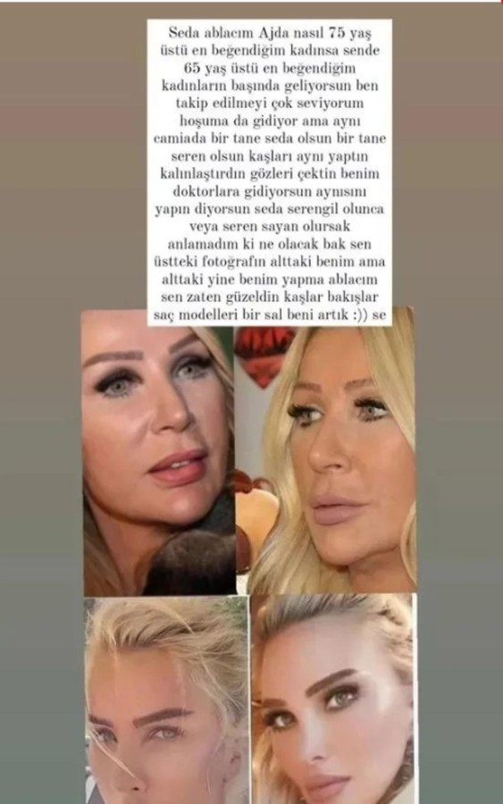 "Seda ablacım Ajda nasıl 75 yaş üstü en beğendiğim kadınsa sen de 65 yaş üstü en beğendiğim kadınların başında geliyorsun. Ben takip edilmeyi çok seviyorum, hoşuma da gidiyor ama aynı camiada bir tane Seda olsun, bir tane Seren olsun. Benim doktorlara gidiyorsun, 'aynısını yapın' diyorsun. Seda Serengil veya Seren Sayan olursak anlamadım ki ne olacak. Bak üstteki fotoğrafın alttaki benim ama alttaki yine benim. Yapma ablacım, sen zaten güzeldin. Kaşlar, bakışlar saç modelleri bir sal beni artık."