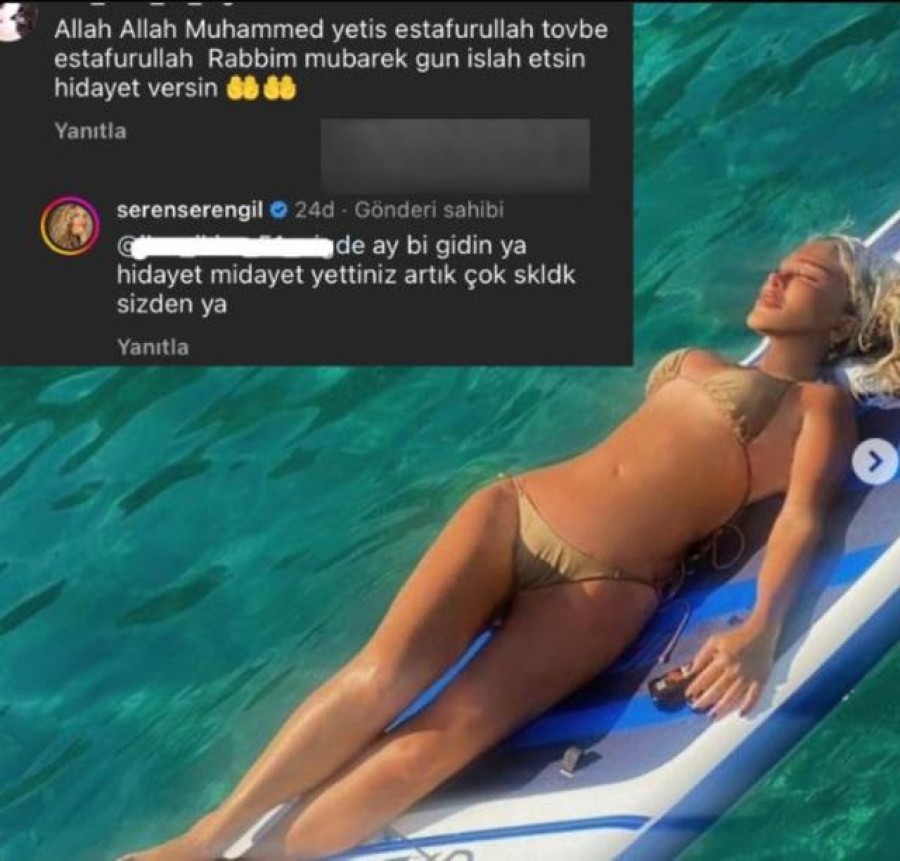 Seren Serengil bu yoruma "Ay bir gidin ya hidayet midayet yettiniz artık çok sıkıldık sizden ya" yazarak sert çıktı.
