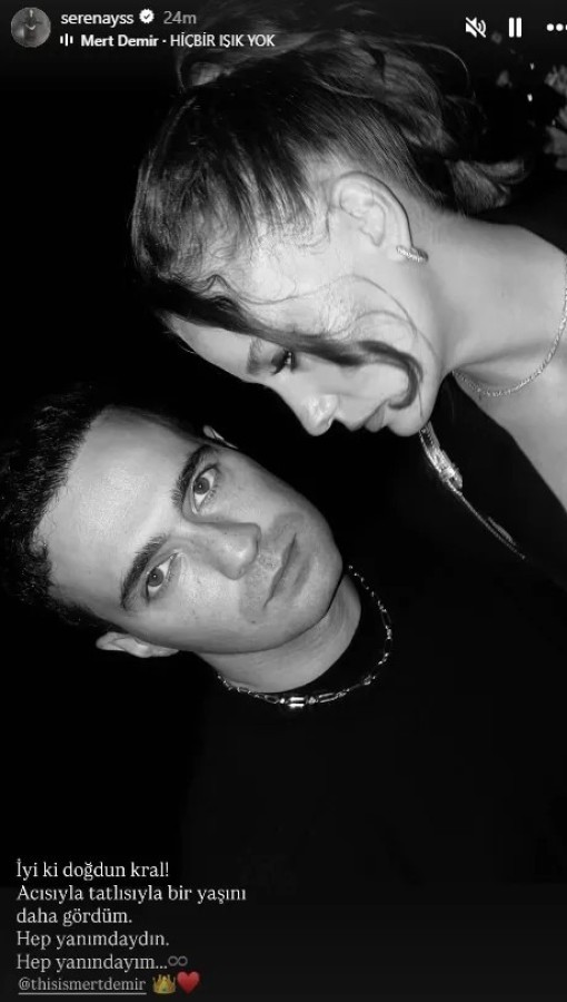 Oyuncu Serenay Sarıkaya, sevgilisi Mert Demir'in doğum gününü "İyi ki doğdun kral" notuyla sosyal medya hesabından yaptığı paylaşımla kutladı.
