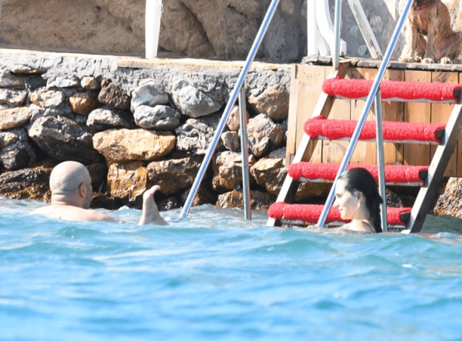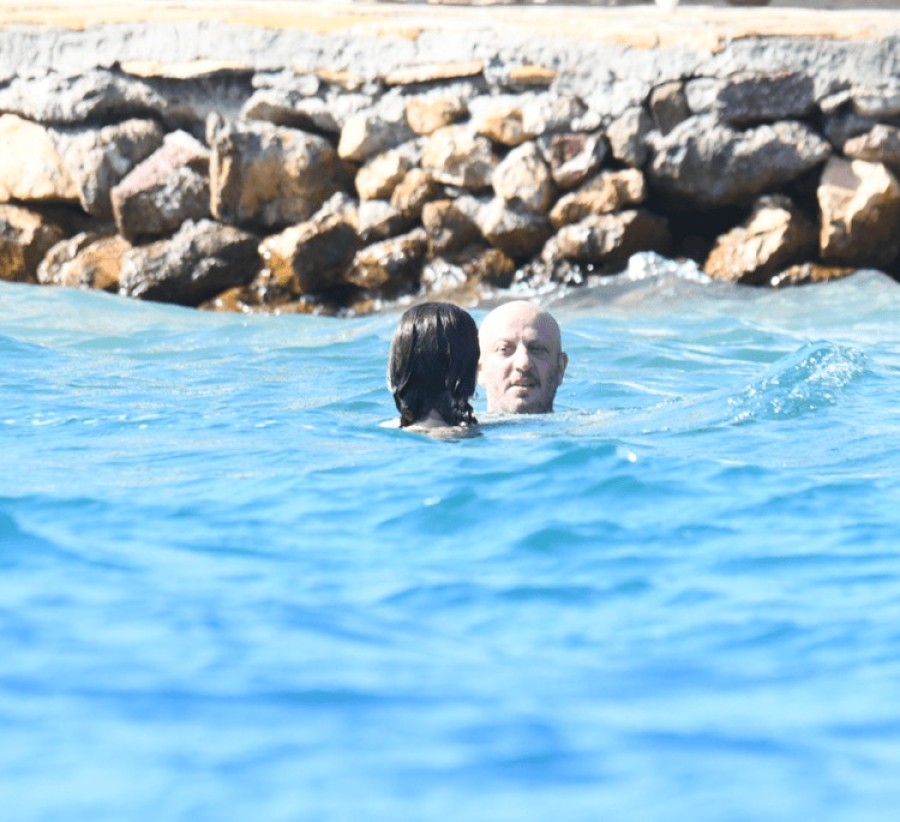 Serkan Keskin göbeğini saklamak için akla karayı seçti, sudan çıkmak için muhabirlerin gitmesini bekledi. Sevgilisi şezlonguna geçip bikinisini değiştirirken, Keskin bir süre daha suda kalmaya devam etti.
