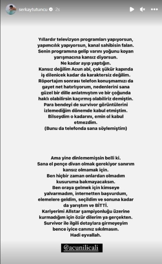 Bir süre sonra Serkay Tütüncü sessizliğini bozarak "Acun Ilıcalı"ya etiketleyip Instagram'dan bir hikâye paylaştı.
