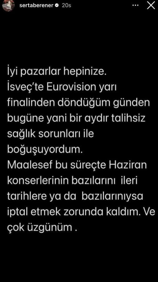 Erener, "İsveç'teki Eurovision Şarkı Yarışması'nın yarı finalinden döndüğüm günden bugüne yani bir aydır talihsiz sağlık sorunlarıyla boğuşuyordum. Malesef bu süreçte haziran konserlerinin bazılarını ileri tarihlere, bazılarını ise iptal etmek zorunda kaldım. Ve çok üzgünüm" dedi.