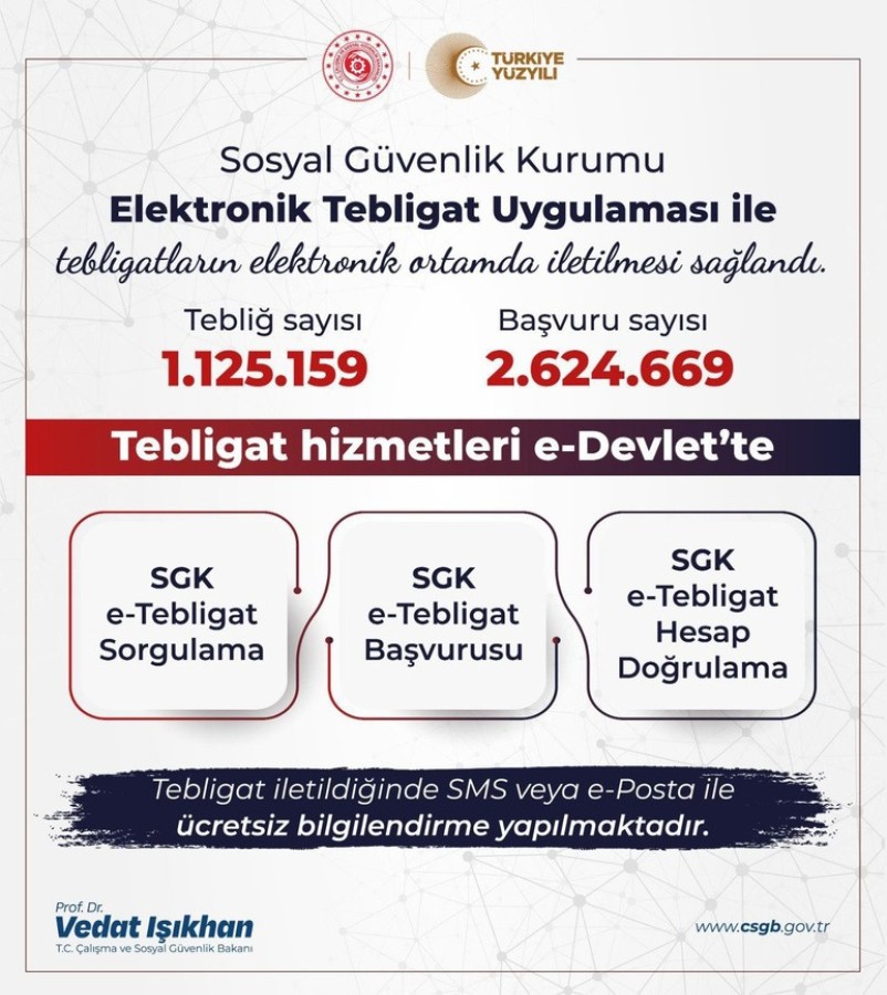 Çalışma ve Sosyal Güvenlik Bakanı Vedat Işıkhan sosyal medya hesabından yaptığı paylaşımda, SGK Elektronik Tebligat Uygulaması ile tebliğ edilmesi gereken evrakların elektronik ortamda imzalanarak tebligat adreslerine kolaylıkla iletilebilmesini ücretsiz sağladıklarını hatırlattı.
