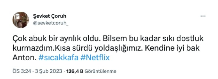 Oyuncu Şevket Çoruh, Netflix'in 'Sıcak Kafa' dizisinin ikinci sezonunun iptal edildiğini 'Çok abuk bir ayrılık oldu' sözleriyle duyurdu.