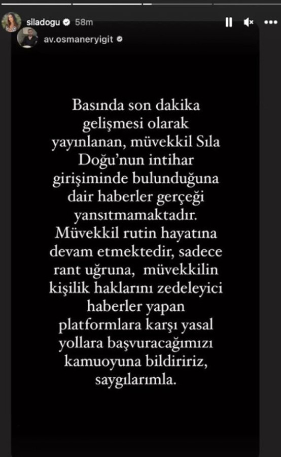 Sosyal medyada hızla yayılan iddiaların ardından Sıla Doğu'nun avukatı Osman Eryiğit sosyal medya hesabından konuyla bir açıklama yaptı. Eryiğit, "Sıla Doğu'nun intihar girişiminde bulunduğuna dair haberler gerçeği yansıtmamaktadır" diyerek intihar olayını yalanladı.