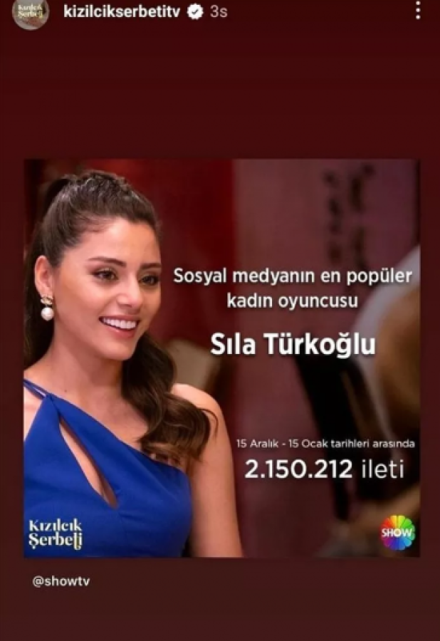 Ekranların aranılan yüzlerinden olan Sıla Türkoğlu, başarısıyla alkış topladı. Güzelliği ile herkesi kendine hayran bırakan Türkoğlu, 15 Aralık- 15 Ocak tarihleri arasında 'Sosyal Medyanın En Popüler Kadın Oyuncusu' oldu.