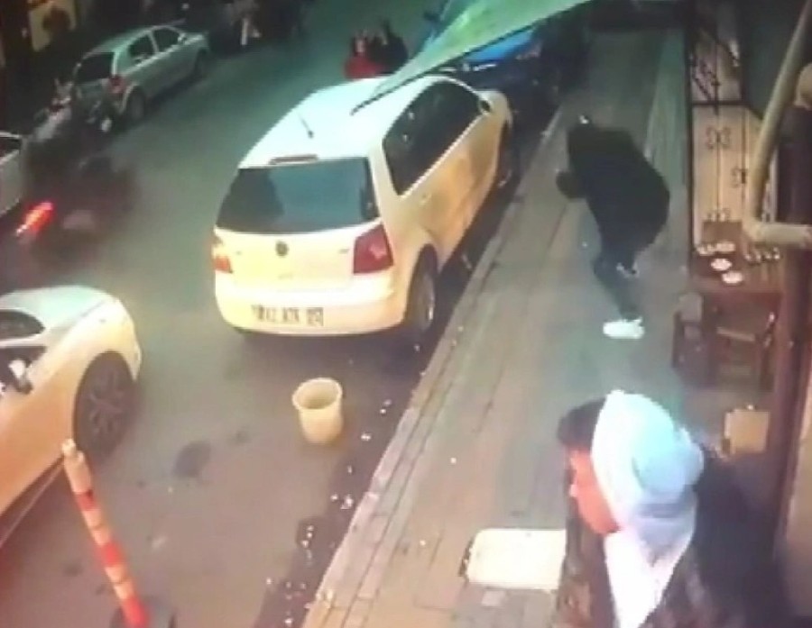 Görüntülerde, 3 kişinin cadde üzerinde çay içtiği görülüyor. İki kişi bir binanın kapı önünde sohbet ederken diğeri kaldırımda yürüyor. Bu sırada caddeden geçen motosikletin yolcu koltuğunda oturan bir kişi kaldırımdaki kişilere doğru bir el ateş ediyor. Sohbet eden iki arkadaş yaşananları fark etmezken, kaldırımda yürüyen kişi son anda yere eğilerek kurşunun hedefi olmaktan kurtuluyor. Saldırganlar kaçarken, saldırıya uğrayanlar çaylarını yudumlamayı sürdürüyor.
