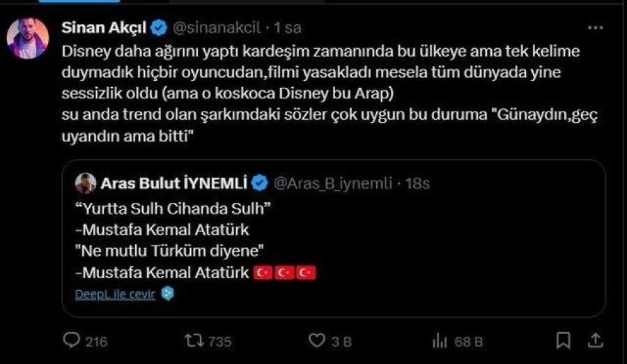Sinan Akçıl da Aras Bulut İynemli'ye tepki gösterdi. "Disney daha ağırını yaptı kardeşim zamanında bu ülkeye ama tek kelime duymadık hiçbir oyuncudan" diyen Akçıl devamında "filmi yasakladı mesela tüm dünyada yine sessizlik oldu (ama o koskoca Disney bu Arap) şu anda trend olan şarkımdaki sözler çok uygun bu duruma 'Günaydın, geç uyandın ama bitti'" dedi.