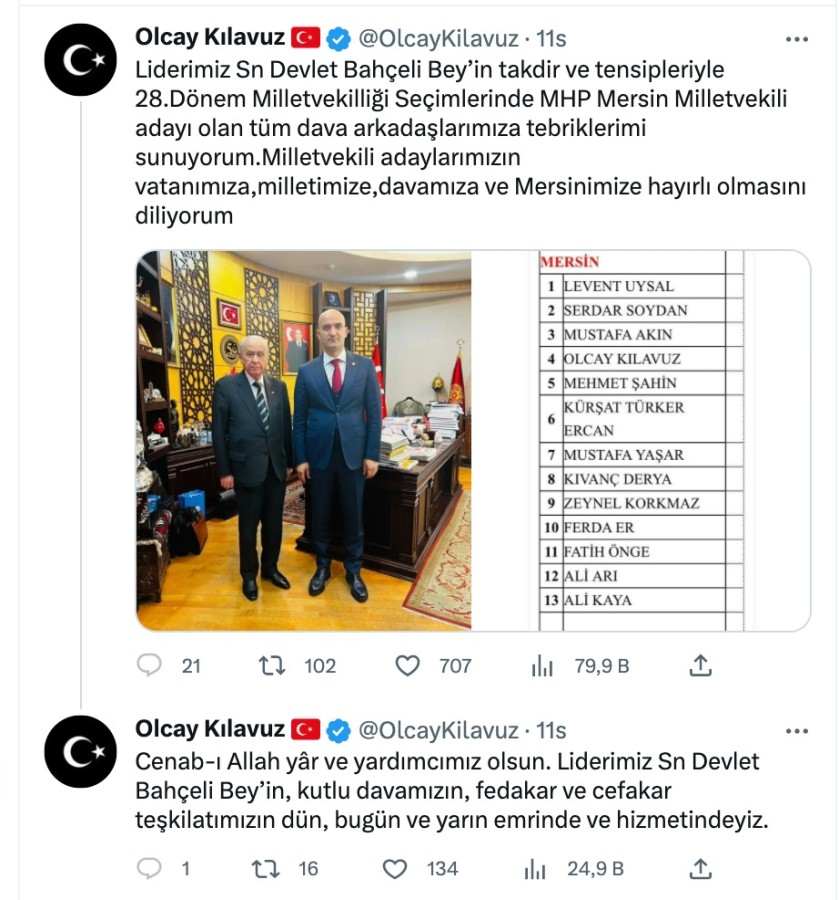 Mersin Milletvekili Olcay Kılavuz Twitter hesabından yaptığı paylaşımda, "Liderimiz Sn Devlet Bahçeli Bey'in takdir ve tensipleriyle 28.Dönem Milletvekilliği Seçimlerinde MHP Mersin Milletvekili adayı olan tüm dava arkadaşlarımıza tebriklerimi sunuyorum.Milletvekili adaylarımızın vatanımıza,milletimize,davamıza ve Mersinimize hayırlı olmasını diliyorum Cenab-ı Allah yâr ve yardımcımız olsun.. Liderimiz Sn Devlet Bahçeli Bey'in, kutlu davamızın, fedakar ve cefakar teşkilatımızın dün, bugün ve yarın emrinde ve hizmetindeyiz" ifadelerine yer verdi.