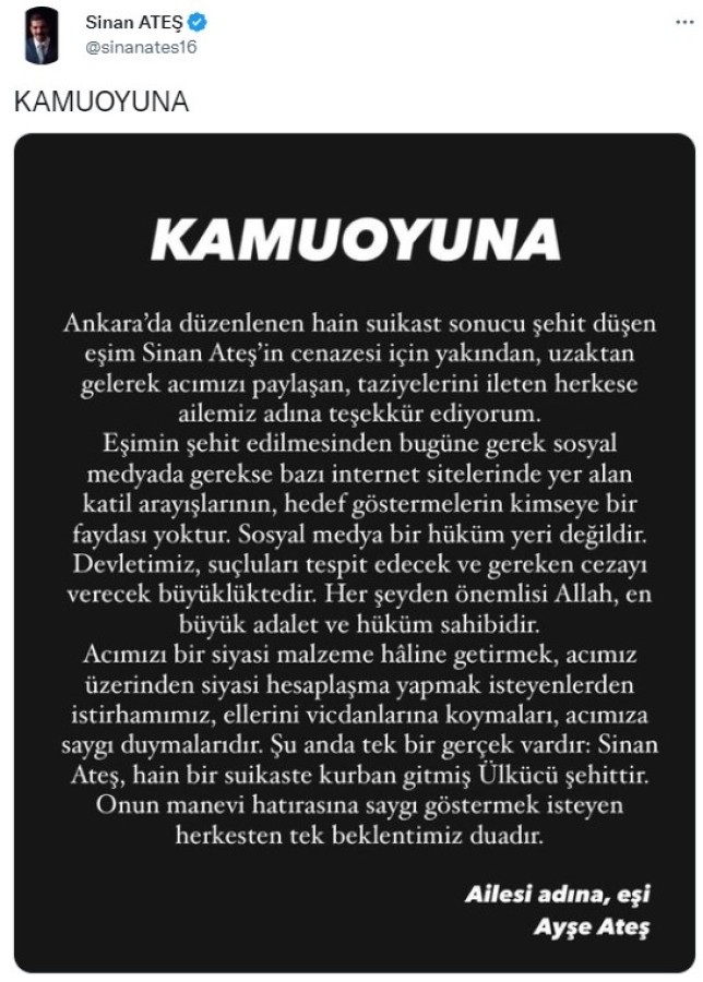 "Ankara'da düzenlenen hain suikast sonucu şehit düşen eşim Sinan Ateş'in cenazesi için yakından, uzaktan gelerek acımızı paylaşan, taziyelerini ileten herkese ailemiz adına teşekkür ediyorum. Eşimin şehit edilmesinden bugüne gerek sosyal medyada gerekse bazı internet sitelerinde yer alan katil arayışlarının, hedef göstermelerin kimseye bir faydası yoktur. Sosyal medya bir hüküm yeri değildir. Devletimiz, suçluları tespit edecek ve gereken cezayı verecek büyüklüktedir. Her şeyden önemlisi Allah, en büyük adalet ve hüküm sahibidir. Acımızı bir siyasi malzeme haline getirmek, acımız üzerinden siyasi hesaplaşma yapmak isteyenlerden istirhamımız, ellerini vicdanlarına koymaları, acımıza saygı duymalarıdır. Şu anda tek bir gerçek vardır: Sinan Ateş, hain bir suikaste kurban gitmiş Ülkücü şehittir. Onun manevi hatırasına saygı göstermek isteyen herkesten tek beklentimiz duadır."