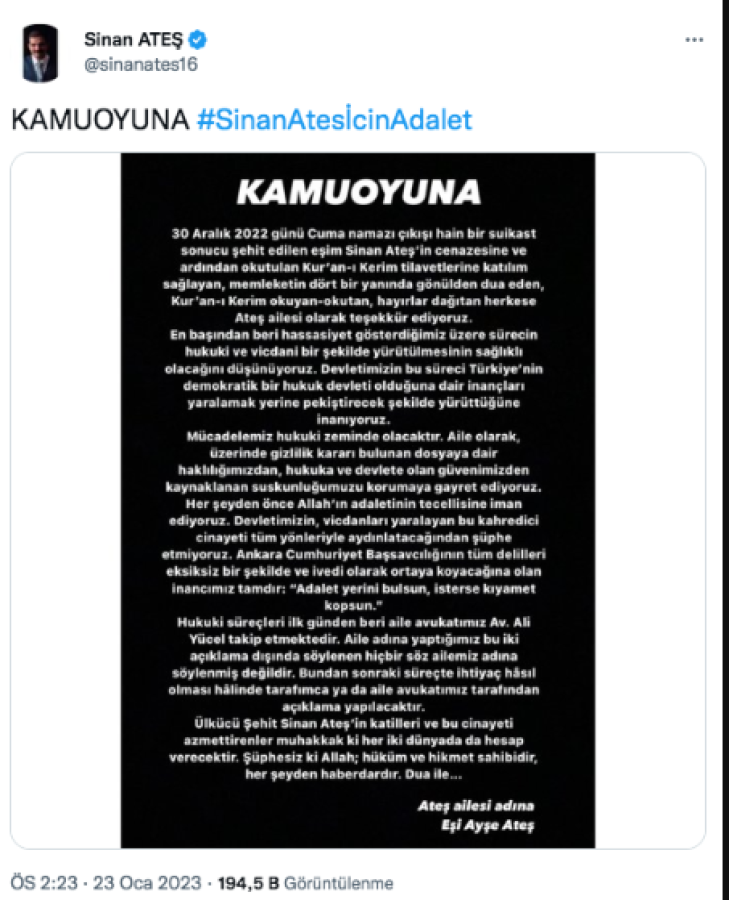 "30 Aralık 2022 günü Cuma namazı çıkışı hain bir suikast sonucu şehit edilen eşim Sinan Ateş'in cenazesine ve ardından okutulan Kur'an-ı Kerim tilavetlerine katılım sağlayan, memleketin dört bir yanında gönülden dua eden, Kur'an-ı Kerim okuyan-okutan, hayırlar dağıtan herkese Ateş ailesi olarak teşekkür ediyoruz.