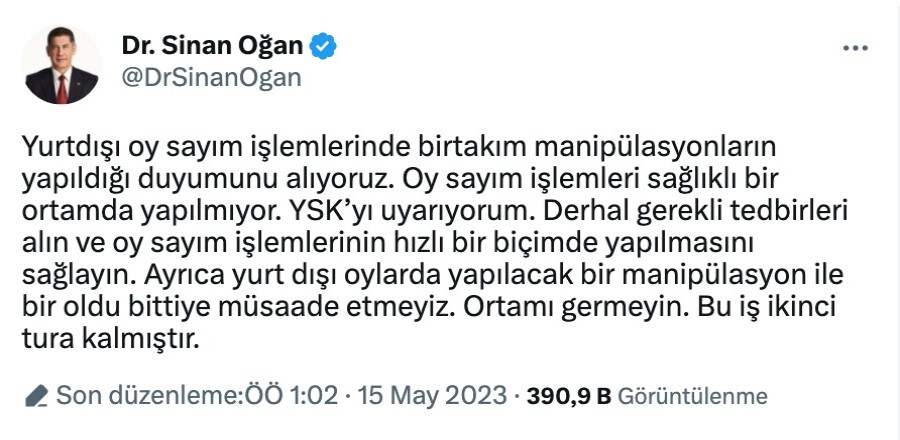 ATA İttifakı'nın Cumhurbaşkanı Adayı Sinan Oğan Twitter hesabından yaptığı paylaşımda, "Yurtdışı oy sayım işlemlerinde birtakım manipülasyonların yapıldığı duyumunu alıyoruz. Oy sayım işlemleri sağlıklı bir ortamda yapılmıyor. YSK'yı uyarıyorum. Derhal gerekli tedbirleri alın ve oy sayım işlemlerinin hızlı bir biçimde yapılmasını sağlayın. Ayrıca yurt dışı oylarda yapılacak bir manipülasyon ile bir oldu bittiye müsaade etmeyiz. Ortamı germeyin. Bu iş ikinci tura kalmıştır" ifadelerine yer verdi.