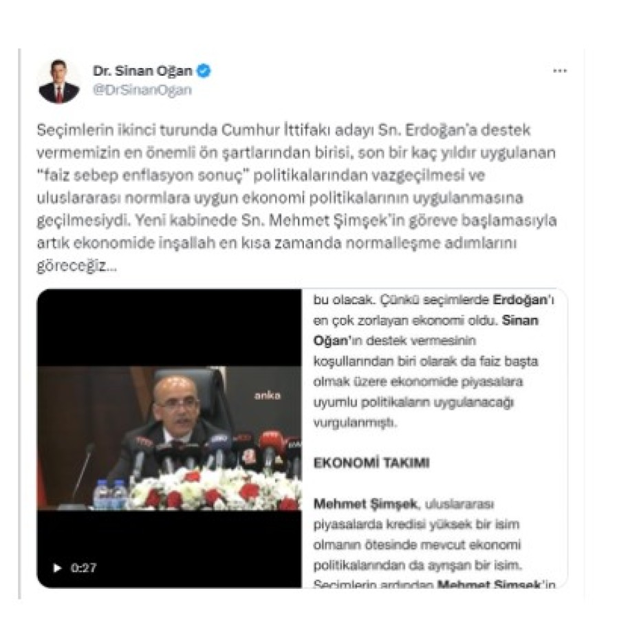 Dağılan ATA İttifakı'nın birinci turdaki cumhurbaşkanı adayı Sinan Oğan, sosyal medya hesabından yeni Hazine ve Maliye Bakanı Mehmet Şimşek hakkında paylaşımda bulundu. Oğan, "Erdoğan'ı destek vermemizin en önemli şartlarından birisi faiz sebep enflasyon sonuç politikalarından vazgeçilmesi" dedi.