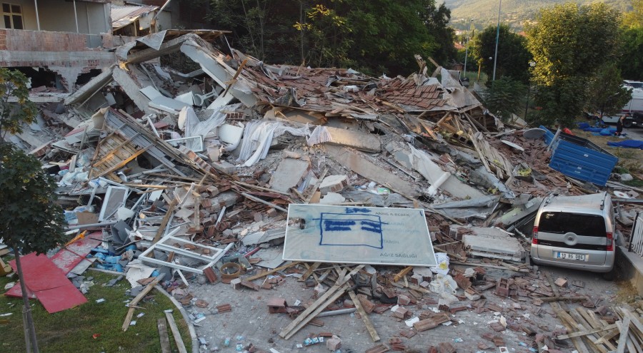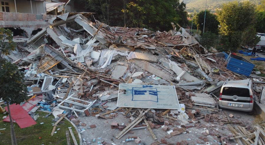 Balıkesir'in Sındırgı ilçesinde yaşanan 6.1 büyüklüğündeki deprem nedeniyle yıkılan bina sabahın ilk ışıklarıyla birlikte dron ile havadan görüntülendi.